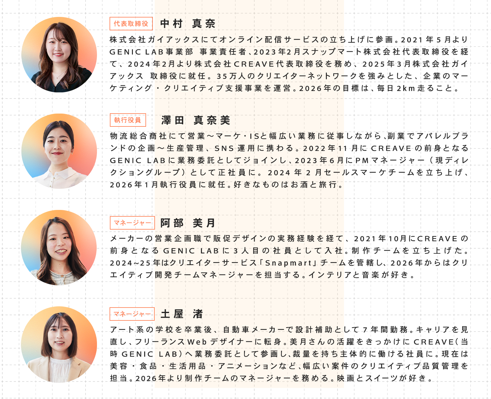 2026年は、2025年に積み上げた挑戦をさらに磨き込み、「CREAVEらしい価値」をより強く、より大きく届けていく一年にしたいです。クリエイターと共に新しい価値を生み出す力、チームで支え合いながら挑戦を続ける文化、そして、世の中にワクワクを届けるクリエイティブ。この勝ち筋をもっと磨き込みながら、これからもダイナミックに、そしてあたたかく、前に進んでいきたいと思います。