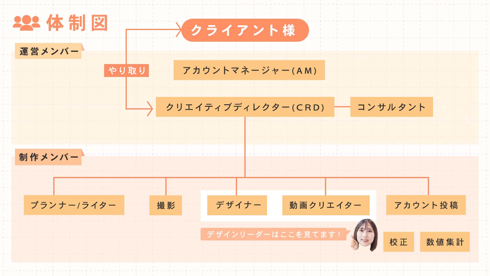 アカウントマネージャー、クリエイティブディレクター、デザインリーダー、そして複数のクリエイターで1つのチームとなって、日々の制作・運用を行っています。