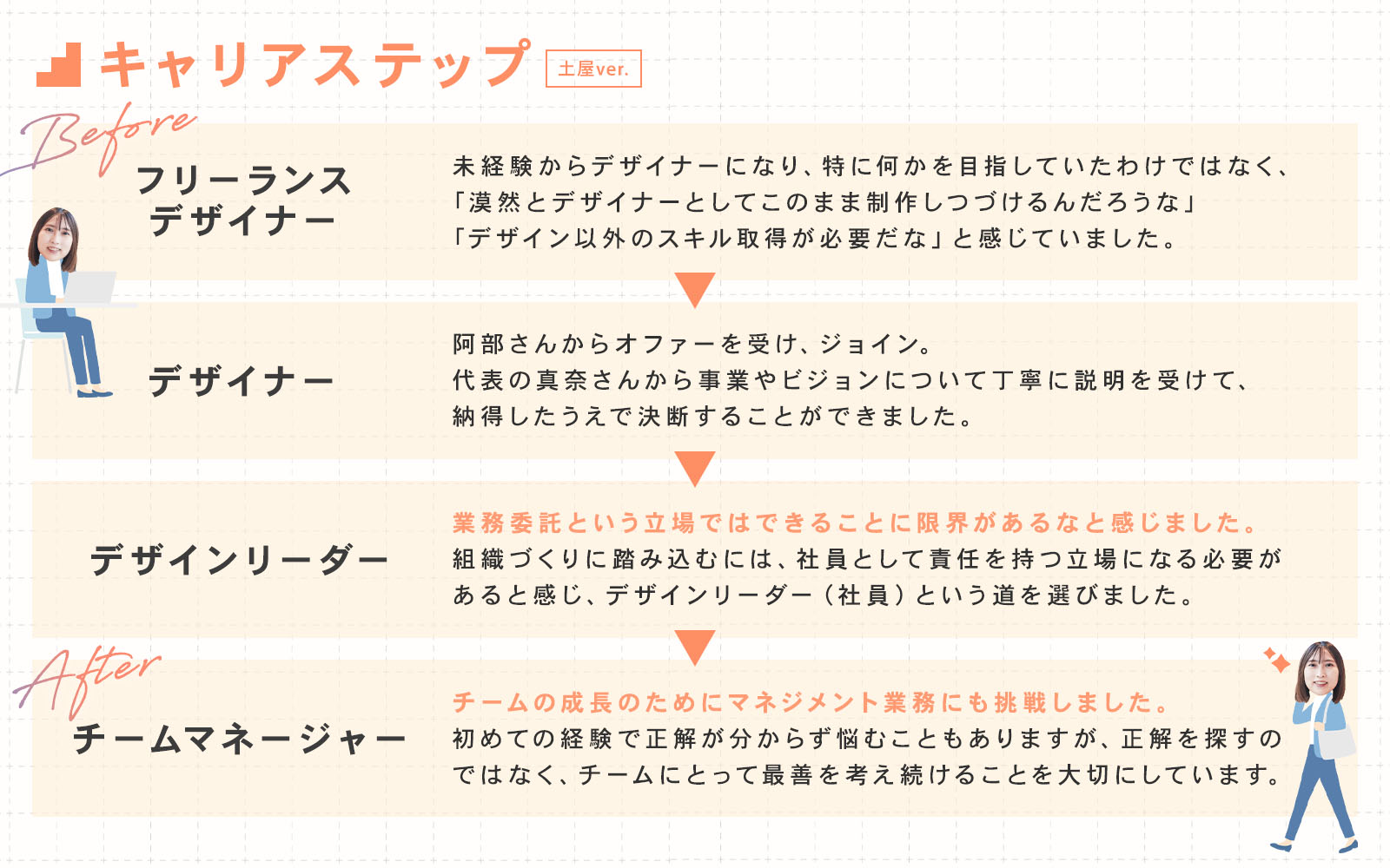 CREAVEでは、デザイナー→デザインリーダー→マネージャーというキャリアステップがあります。本人のスキルや希望にあわせて相談しています。