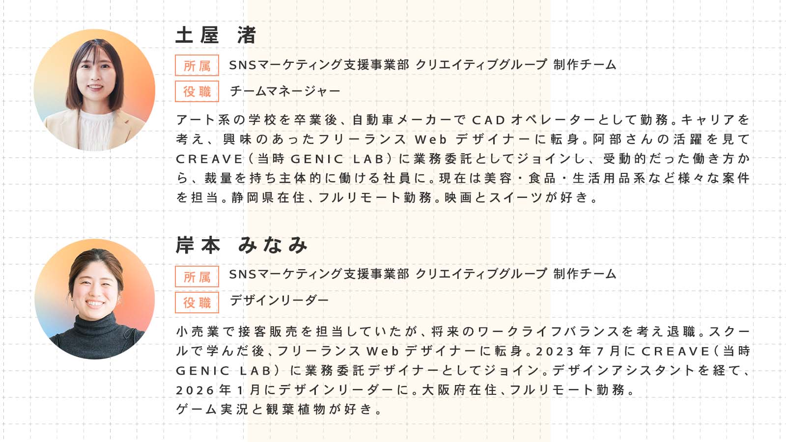 本記事では、未経験から業務委託デザイナーに、そして社員・アルバイトになり、現在はデザインリーダーとして約80名のクリエイターを束ねる土屋・岸本の2名にインタビュー。「プレイヤーからマネジメントへ」という変化の中で見えた景色や、チームで成果を出す喜び、そしてCREAVE独自のキャリアステップの裏側を詳しく紐解きます。