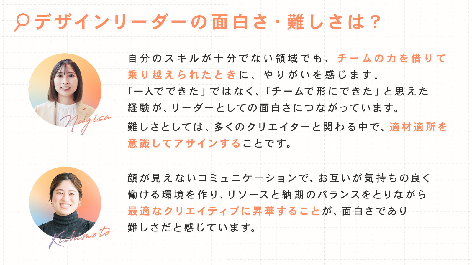 岸本:クリエイターのみなさんと一緒に、より良いクリエイティブを作っていく意識を持ち続けることです。目的・目標を達成するためのブラッシュアップとして、デザインのフィードバックをしていくこと。私がデザイナーの時に、リーダーの方たちにしていただいたことを引き継いでいきたいと思っています!