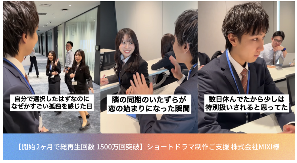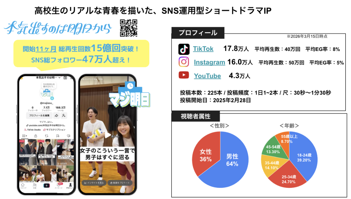 弊社は約1年前に「本気出すのは明日から」通称「マジ明日」で親しまれるショートドラマアカウントの運営を開始しました。VSD形式を採用した「マジ明日」では、総再生回数15億回、SNS総フォロワーは45万人を突破しており、ファンの数も着実に増加していると実感しております。