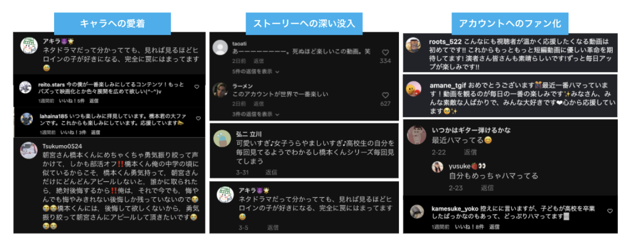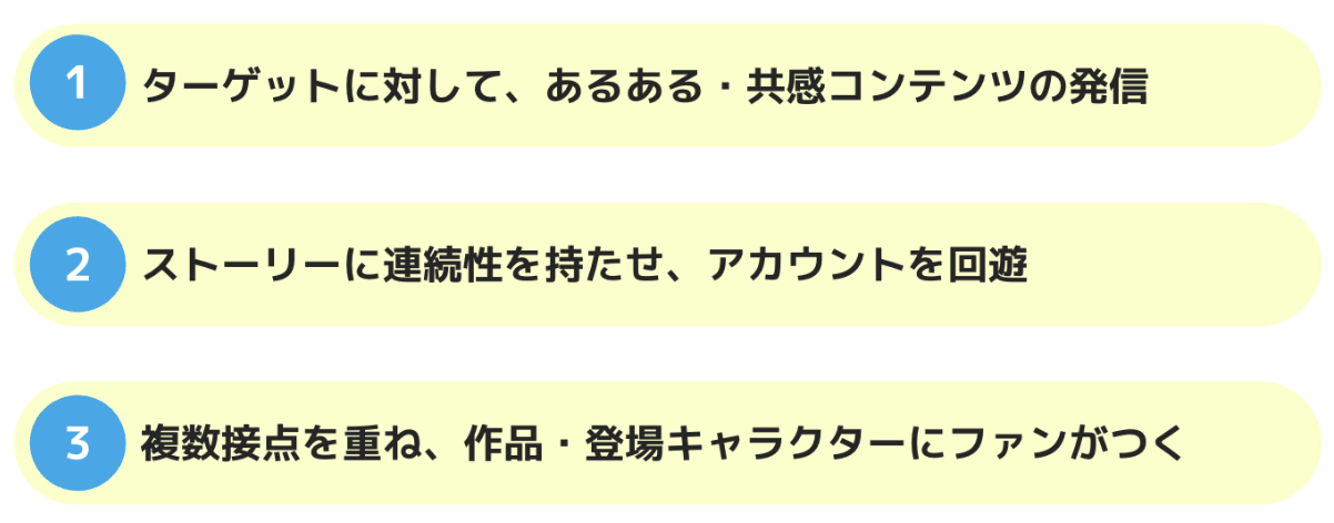 ターゲットに刺さりやすいあるある・共感コンテンツを連続性を持たせた数話構成のストーリーで展開することにより、アカウント内回遊を促進しつつ、複数回接点を実現することで、登場キャラや作品にファンがつきます。