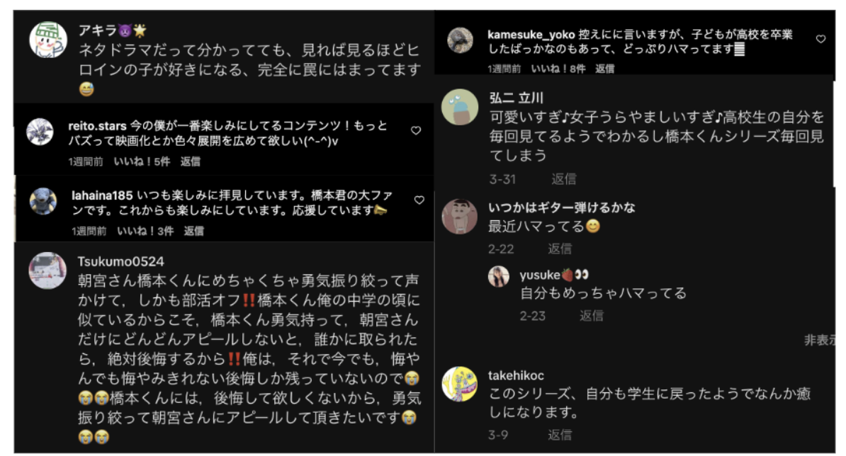 また、既に売れている著名人やインフルエンサーではなく、役者/タレントの卵など所謂ノンタレを起用することによって、俳優への愛着ではなく作品のキャラへの愛着形成を狙っています。