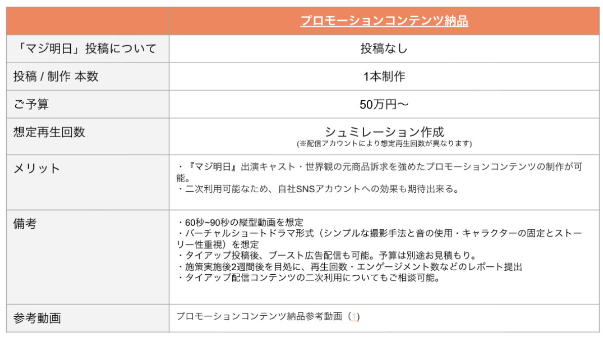 マジ明日アカウントでの投稿は行わず、企業様のアカウントで投稿していただくため、あくまでファンの反感を買わず、それでいてマジ明日スピンオフのような形で商品訴求を可能にしたプランです。