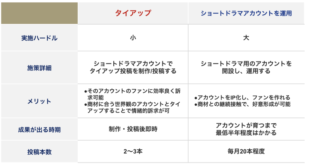 2つ目が、投稿内で商品サービスの訴求はせず、ターゲット層に刺さるような内容のショートドラマを配信するアカウントを開設し、そのアカウントを運営・スポンサードする形で伸ばすことで、ブランド認知やブランド想起/好意度を向上させるという手法です。