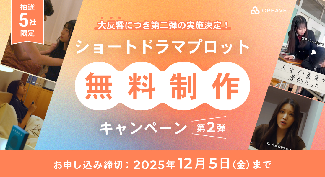 クリエイターとの共創を通じて企業のマーケティング課題を解決する、株式会社CREAVE(本社:東京都千代田区、代表取締役社長:中村真奈、以下 CREAVE)は、企業様の商品・サービスがドラマに登場するショートドラマプロットを無料制作・納品するお得なキャンペーンの第二弾を開催いたします。ドラマのストーリーを通じたプロモーションで、広告感を抑えつつ商品の認知度拡大・好意度醸成を促進できる「ショートドラマ制作プラン」を無料で体験できるようなキャンペーンを10月末までで実施したところ、予想を上回る反響があったため第二弾の実施を決定いたしました。ぜひこの機会にご検討ください。