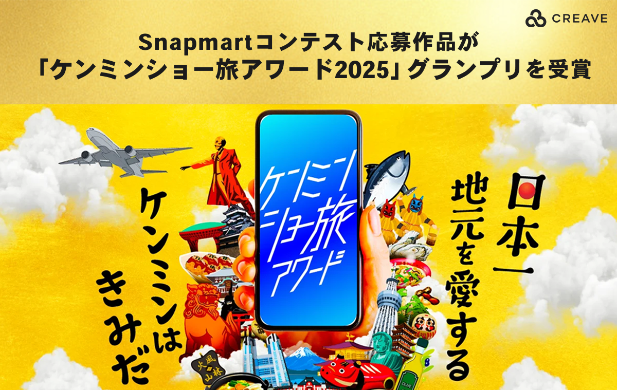 このたび、弊社ではケンミンショー旅アワード実行委員会(読売テレビ放送株式会社、株式会社プログレス)が実施する“ケンミン愛”あふれる動画の投稿を募るコンテスト「ケンミンショー旅アワード2025」において、CREAVEが運営する「Snapmart」で開催したコンテスト応募作品がグランプリを受賞しました。