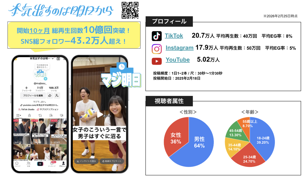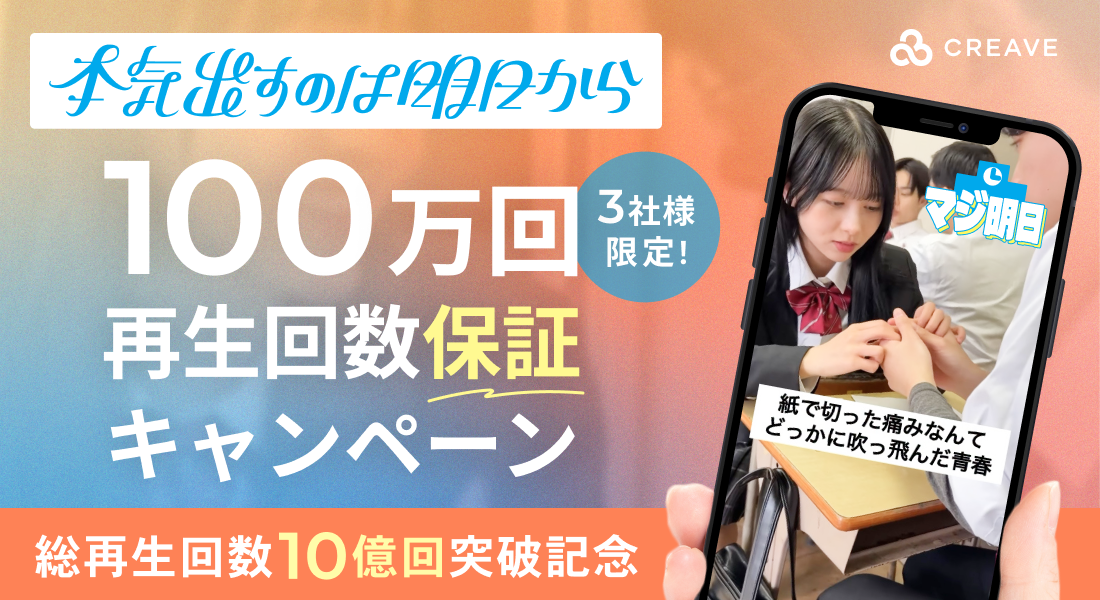 株式会社CREVEが手がける、バーチャルショートドラマを活用した自社IP『本気出すのは明日から”マジ明日”』のSNSアカウント開始10ヶ月で総再生回数10億回、フォロワー数40万人を突破したことを記念し、3社様限定「再生回数保証タイアップ投稿」キャンペーンを開始致しました。