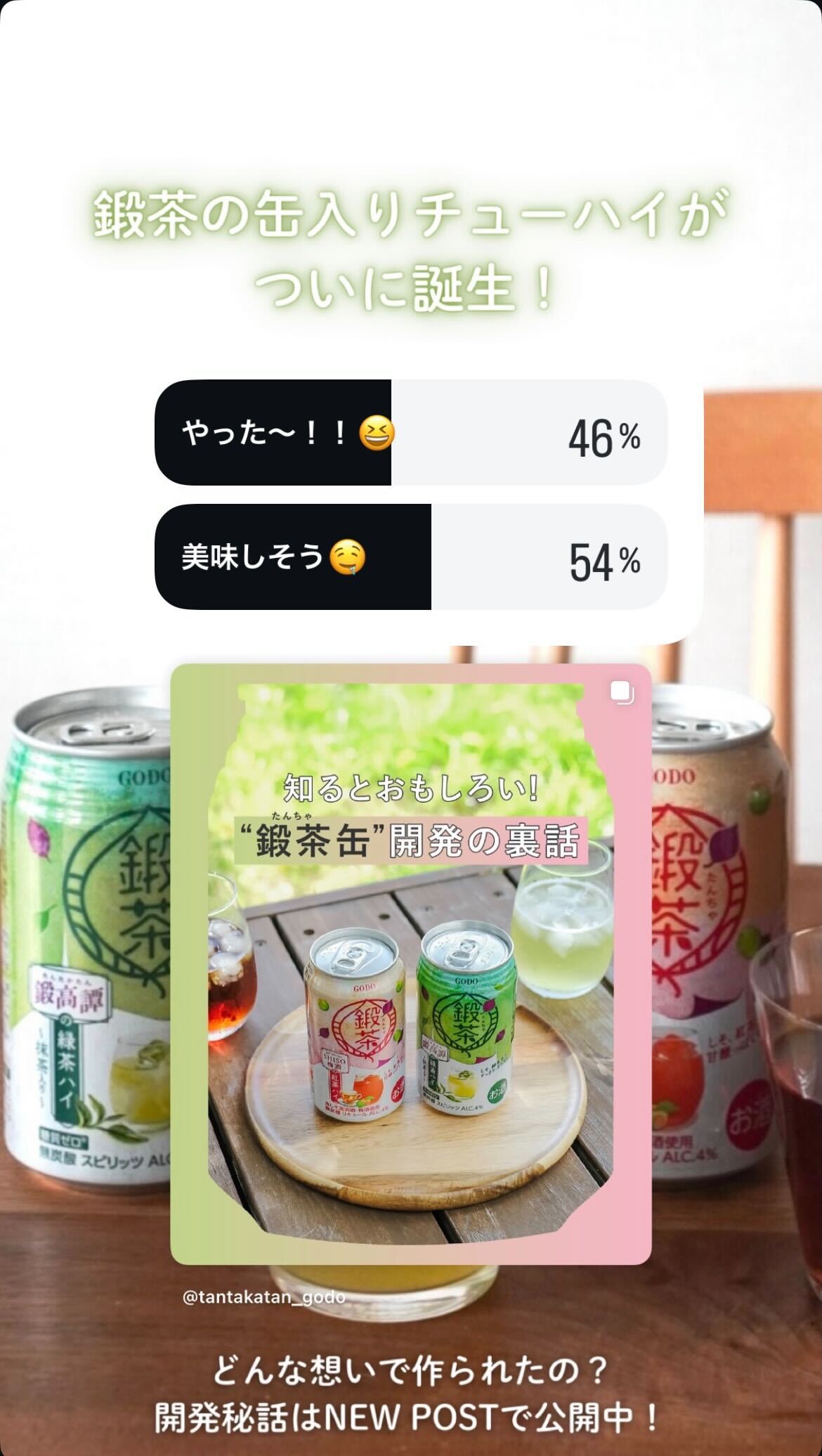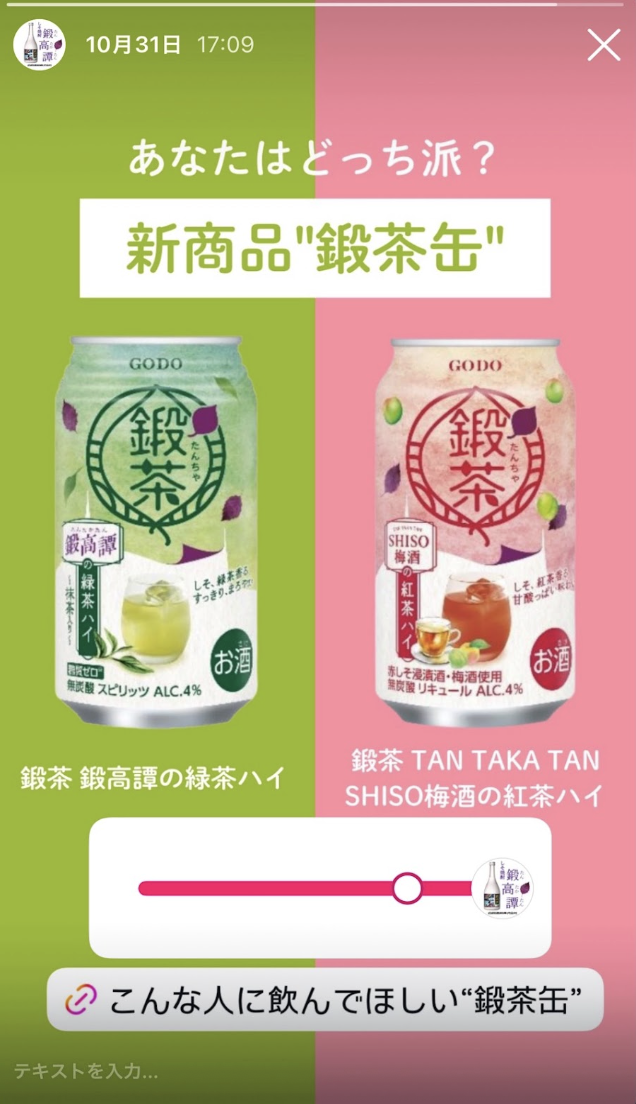 また、ストーリーズ投稿も合わせて実施し、鍛高譚のファンであるフォロワーに「鍛茶缶」発売を周知することができ、認知拡大・販売促進に寄与したと考えます。