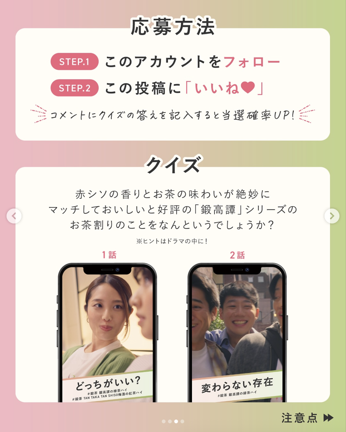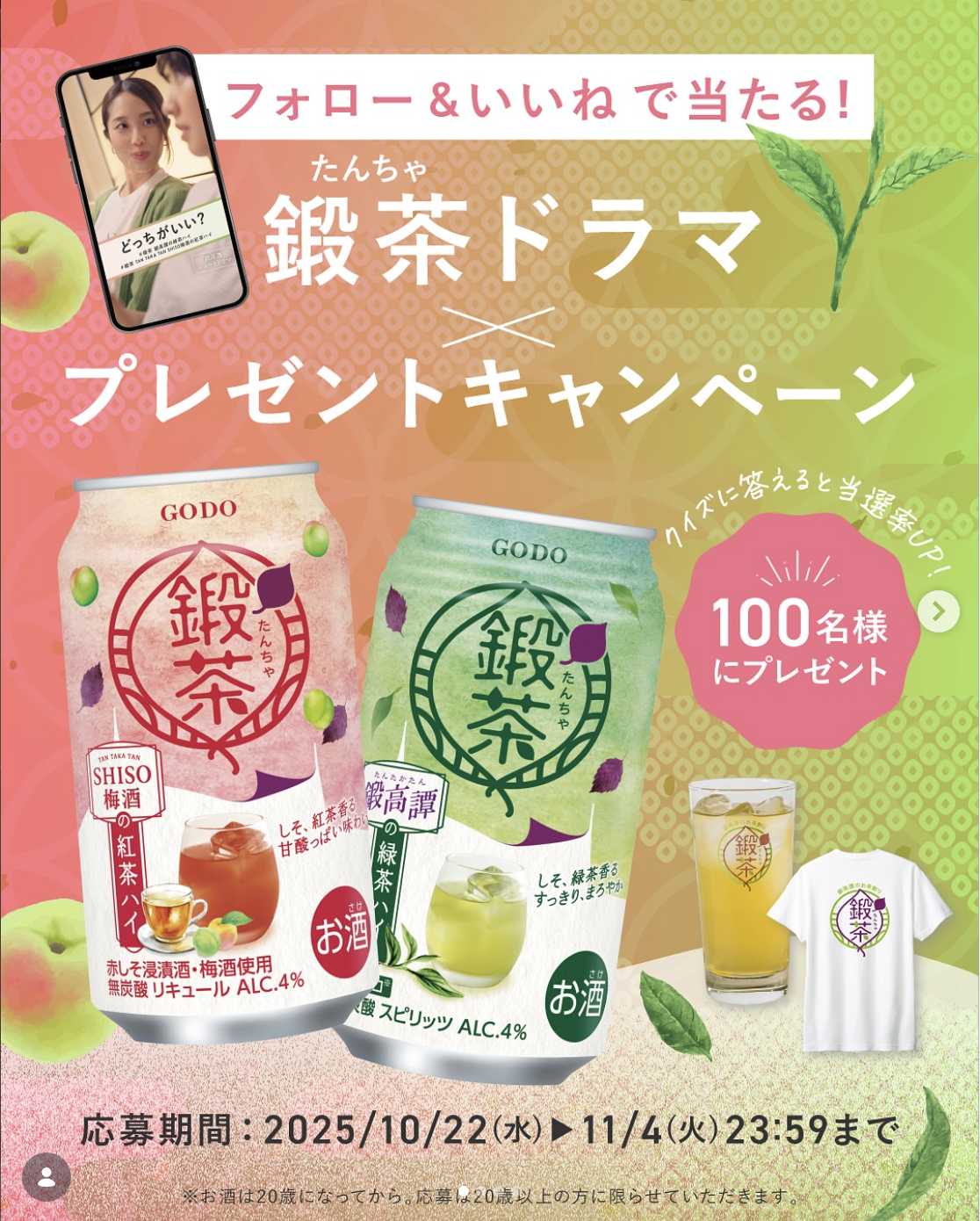 ショートドラマの公開を記念して、抽選で鍛茶缶2種とオリジナルグッズが合計100名様に当たるキャンペーンを実施しました。